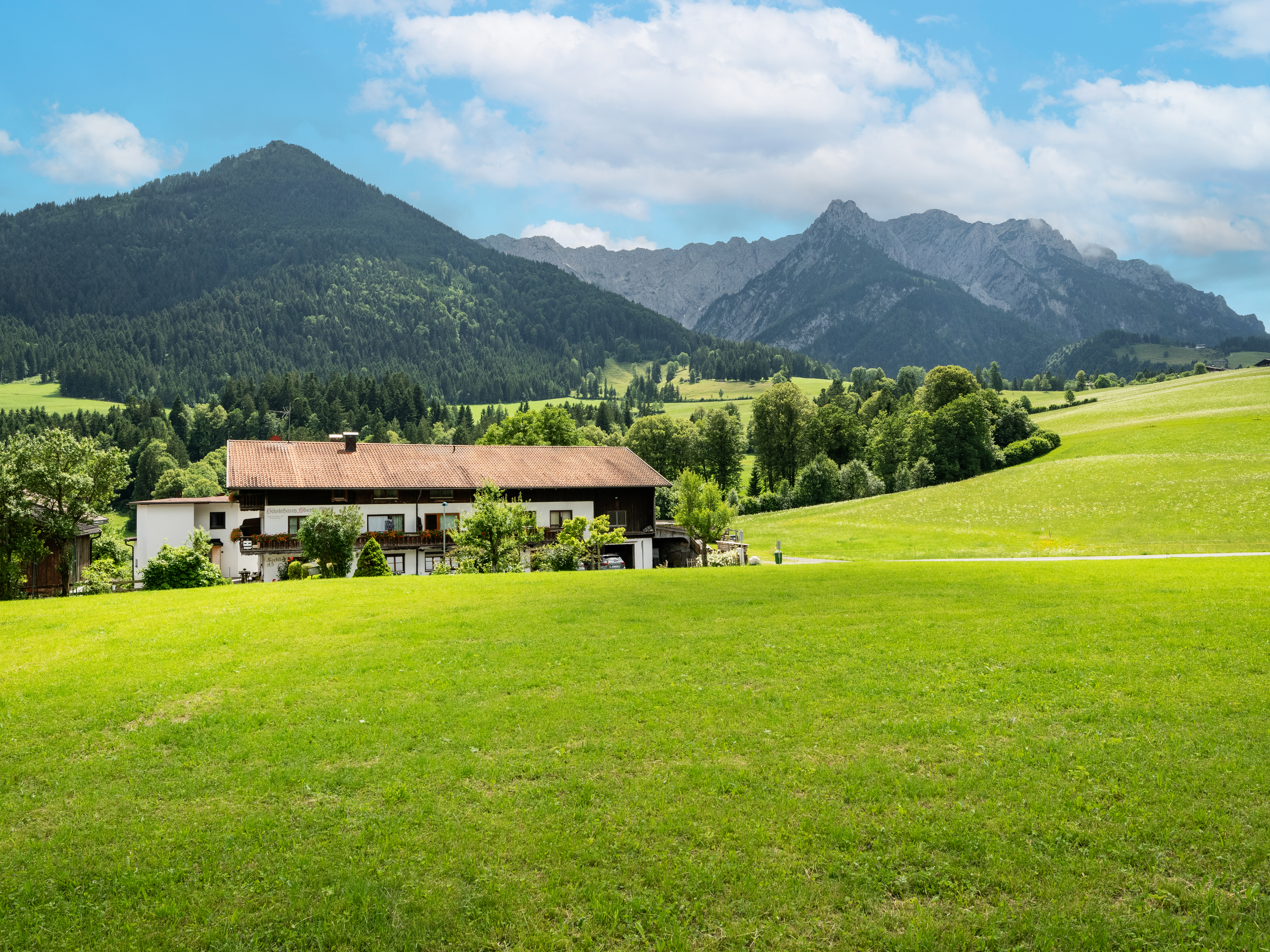 Am Fuße des Zahmen Kaisers, in einer Höhe von 700 m über dem Meeresspiegel, eingerahmt von grünen Wiesen und grasenden Kühen liegt unser Gästehaus.